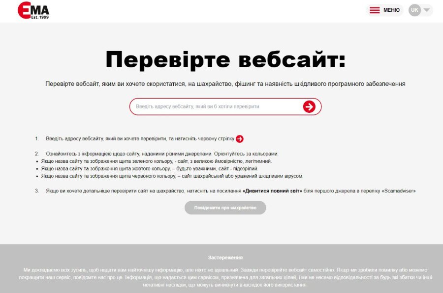 - перевіряйте сайт, послугами якого збираєтесь скористатися, на наявність в списку шахрайських сайтів через сервіс Асоціації "ЄМА" CheckMyLink.