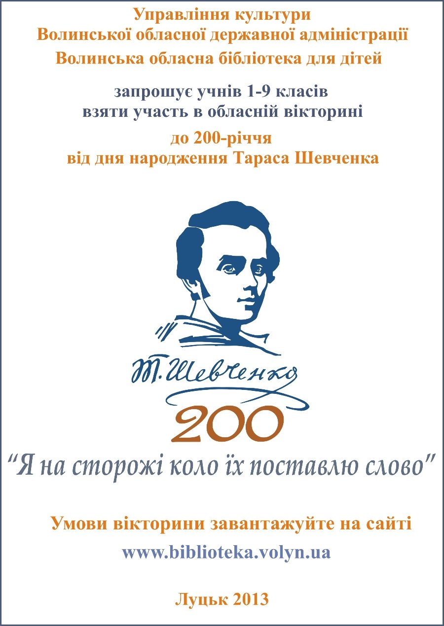 Мета вікторини - залучення школярів області до поглибленого вивчення творів Шевченка, літератури про життя і творчість великого українського письменника, популяризації української мови та літератури, залучення підростаючого покоління до художнього слова, пожвавлення роботи дитячих та шкільних бібліотек