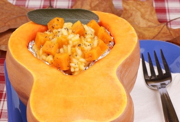 6. Гарбуз «гітару» розріжте уздовж, видаліть м’якоть, використовуй як блюдо для подачі різото на стіл. Перш ніж подавати різото, дно та стінки блюда-гарбуза краще вистелити фольгою.