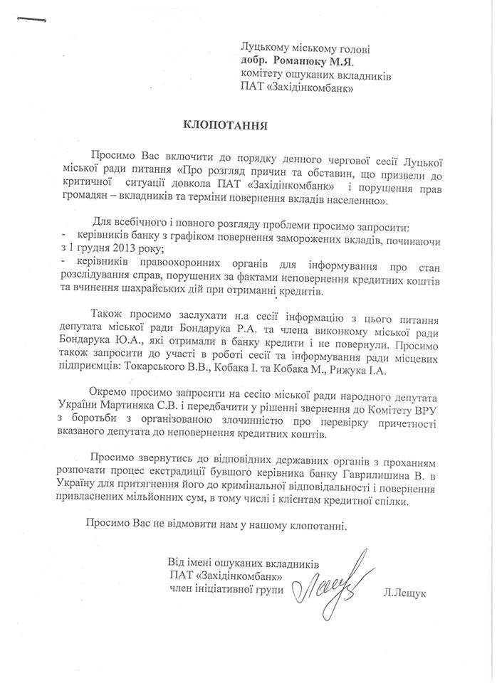 Окрім того, вкладники банку надіслали у міськраду клопотання про розгляд їх проблеми, яке, загалом повторює вимоги, викладені у проекті рішення.