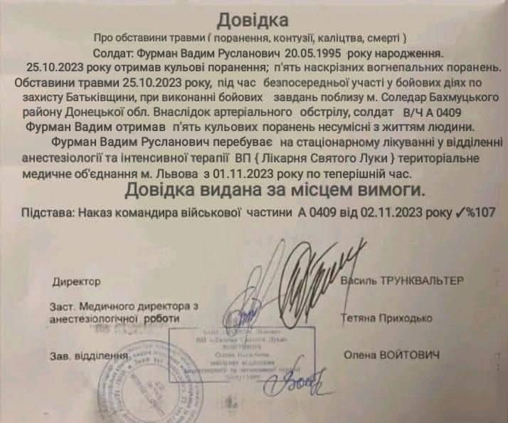"Прохання долучитись кожного для проведення операції для цього хлопчини. Воїн з Луцька Фурман Вадим. Привезли з Бахмута з "тридцятки". Під час виконання бойового завдання отримав п'ять кульових поранень і врятував двох бойових побратимів", - йдеться в повідомленні.