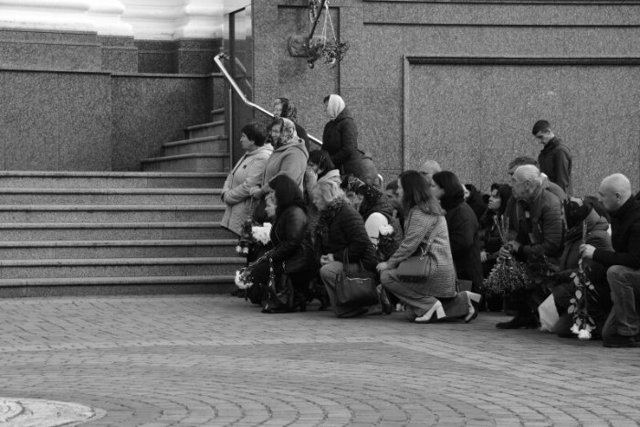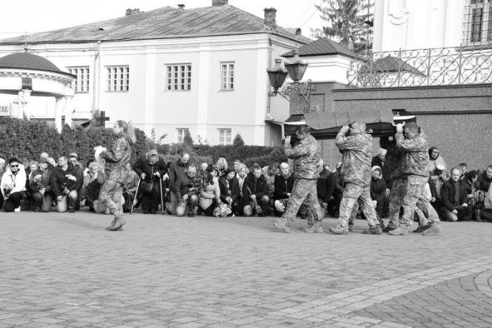 Після завершення панахиди домовину з тілом Героя прощальною ходою пронесли Театральним майданом. Біля фотостенду “Герої Небесної Сотні – Загинули за єдність України” скорботна процесія зупинилася і виконала Державний Гімн.