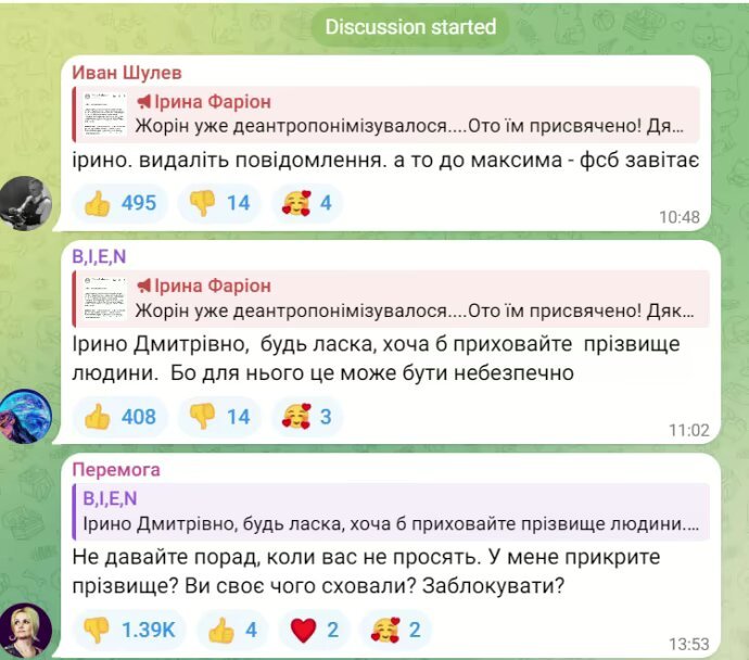 У коментарях до поста Фаріон відразу попросили приховати дані хлопця (зокрема, його прізвище), щоб не наражати його на небезпеку. Але мовознавиця відмовилася це зробити і пригрозила заблокувати користувача за таку пораду.