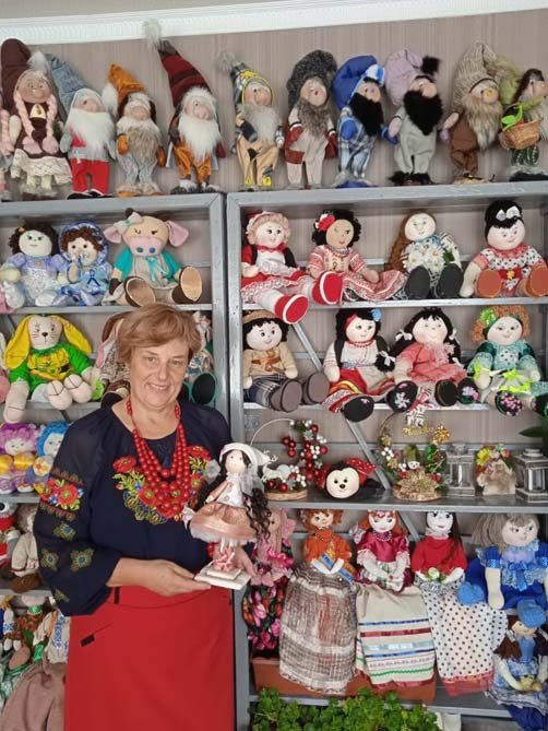 На кріслах у її будинку примостилися бородаті гноми, біля вазонів – незвичайна парочка синіх котів, на дивані красуються оригінальні подушки. Квіти стоять у великих вазах, які теж з картону склеїла господиня. А зал схожий на закулісся лялькового театру. Тут на великій полиці, яку спеціально для іграшок змайстрував чоловік, посміхаються і підморгують зайці, гноми, гарненькі молодички, є навіть бабуся, яка ніби прийшла із казки «Колобок». Усі пошиті із тканини, одягнені в оригінальні костюми. Жодної однакової іграшки нема – всі унікальні. Ляльки-модниці прикрашені бусами, а кожна стрічечка на їхніх спідницях дбайливо підібрана за кольором. Одразу уявила, яка то скрупульозна і непроста робота! Це ж треба продумати кожну деталь, знати, як її повернути, пришити.