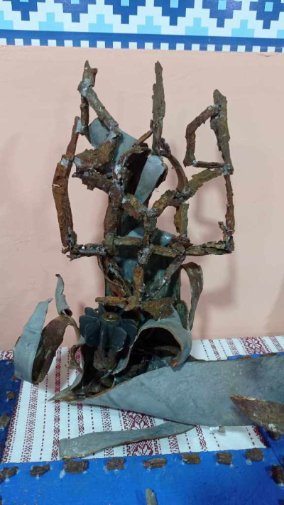 Великий набір уламків – це і гради, і шрапнелі, і касетні бомби, які розриваються у вищезгаданому населеному пункті щодня. Творчість митця з Херсонщини розділена на три частини: це картини з уламків снарядів «Жахливі квіти війни», фотофакт «Україна, нескорена війною» і збірка спогадів про окупацію.