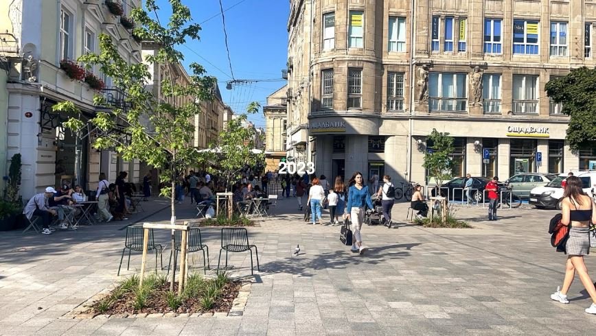 Але так вийшло, що одна компанія-забудовник змушена була прокласти комунікації якраз під цією територією. Вони могли б після цього покласти назад те саме покриття, але з ними домовились, щоб вони замінили плитку на більш зручну. Також ми почали думати, як використати ситуацію і по-новому облаштувати цей простір. Зміни надихнули всіх і коли вже почалися роботи, до нас звернулася сусідня кав’ярня з питанням, як можна долучитися, щоб покращити простір. За їхні кошти закупили і встановили вуличні меблі», — розповіла Марина Пелещак.