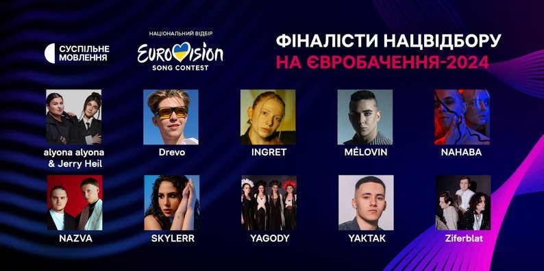 Оголосили імена та назви пісень 10 фіналістів національного відбору на "Євробачення-2024". Почути обрані пісні українці зможуть у січні. Серед фіналістів - 18-річний волинянин Ярослав Карпук, який який виступає під псевдонімом Yaktak.
