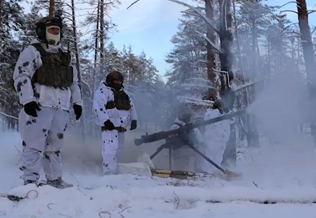 Бійці Камінь-Каширського батальйону Волинської бригади тероборони у засніженому Серебрянському лісі на Луганщині «насипають» окупантам зі станкового протитанкового гранатомета СПГ-9 «Спис».
