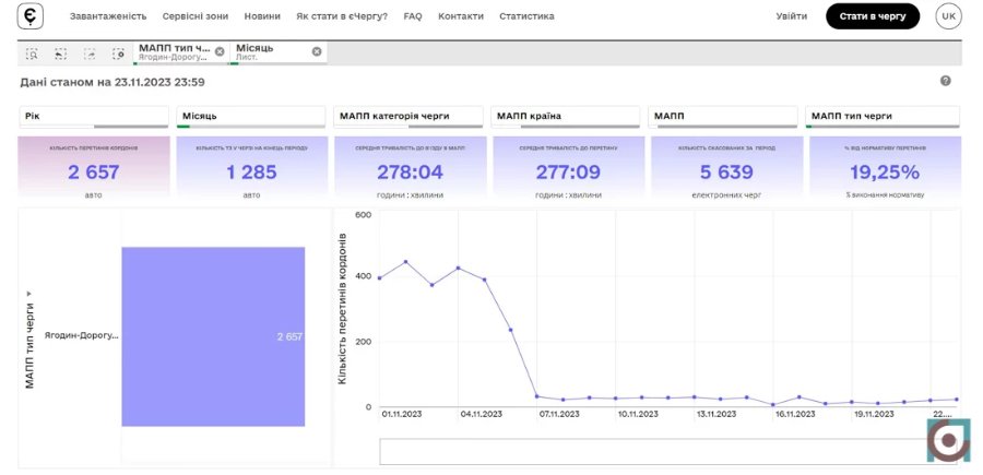 Відповідно до даних електронної черги для вантажівок, впродовж 10 місяців 2023 року «Ягодин» в напрямку Польщі перетинало по 16-18 тисяч фур на місяць, тобто по 400-600 автівок на добу. З моменту блокування руху польськими протестувальниками ця цифра зменшилася до 15-30 автівок на добу. Рух із Польщі в Україну також ускладнений.