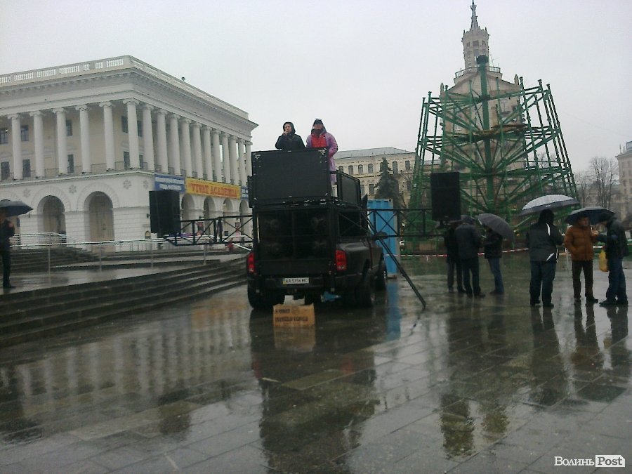 На майдан підігнали спеціально облаштоване для мітингів авто, яке до того ж слугує сценою для тих, хто виступає.