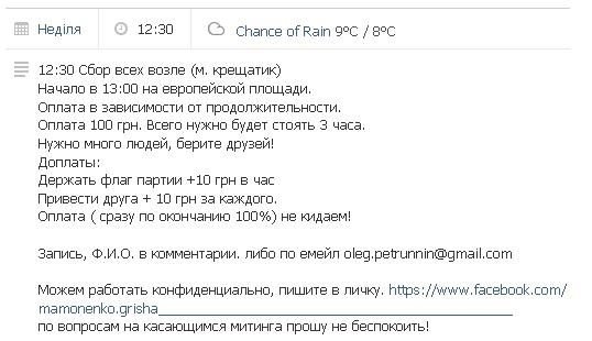 Організатор групи пропонують 100 гривень за 3 години участі у мітингу, – пише Gazeta.ua.