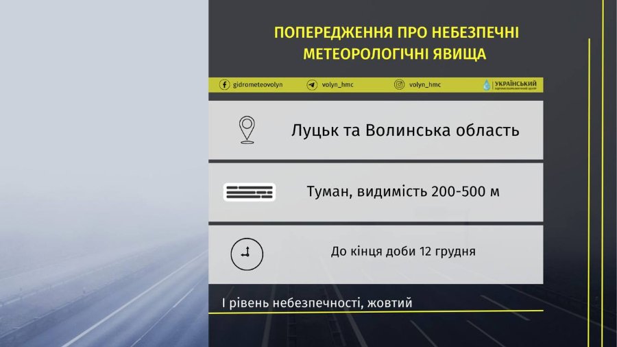 "Попередження про небезпечні метеорологічні явища. До кінця доби 12 грудня, по області та в Луцьку, очікується туман з видимістю 200-500 метрів. Рівень небезпечності – І, жовтий", - йдеться у повідомленні Волинського обласного центру з гідрометеорології.