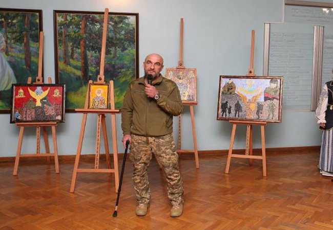 Атовець, учасник бойових дій, військовий капелан Руслан Кашаюк із Луцька презентував у Волинському національному університеті благодійну виставку-продаж власних картин задля допомоги волинським захисникам.