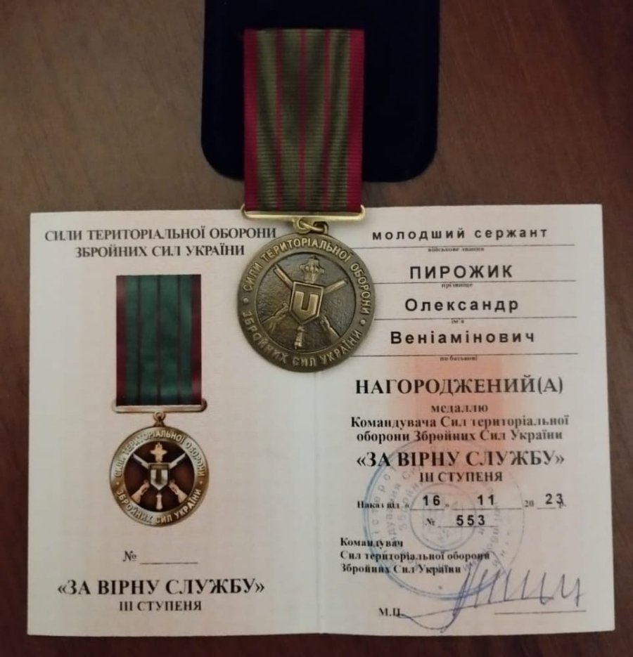Олександр Пирожик з рук Командувача Сил територіальної оборони ЗСУ одержав медаль «ЗА ВІРНУ СЛУЖБУ» ІІІ ст., а Олександра Радчука удостоєно почесним нагрудним знаком Головнокомандувача Збройних Сил України «СРІБНИЙ ХРЕСТ».