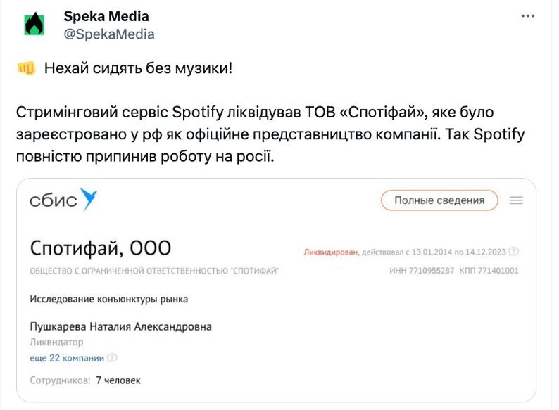 Заявку на ліквідацію компанія Spotify подала у лютому 2023 року, а з 14 грудня ТОВ "Спотіфай" повністю припинив роботу.