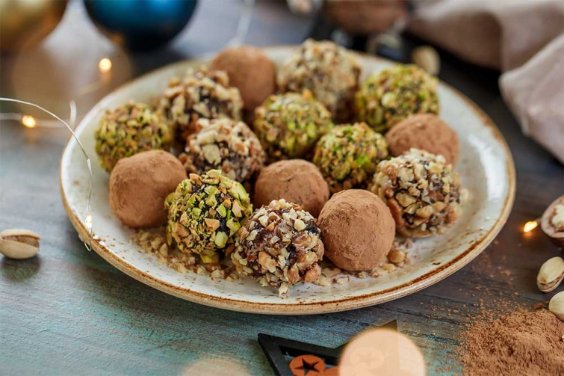 4. Потім очистіть від шкаралупи 100 г фісташок і подрібніть ножем. Те саме зробіть зі 100 г волоського горіха. Другу частину фінікових трюфелів обваляйте в подрібнених крихтах фісташок, а третю – у крихті з волоських горіхів. Поставте всі трюфелі в холодильник на кілька годин.