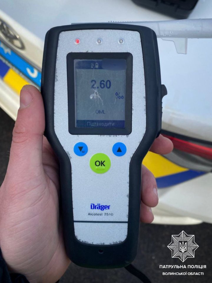 Під час спілкування з водієм інспектори виявили у нього ознаки алкогольного спʼяніння. Чоловік погодився пройти освідування на місці події. Результат огляду на приладі Драгер становив 2, 6 проміле, що перевищує максимально допустиму норму в 13 разів.