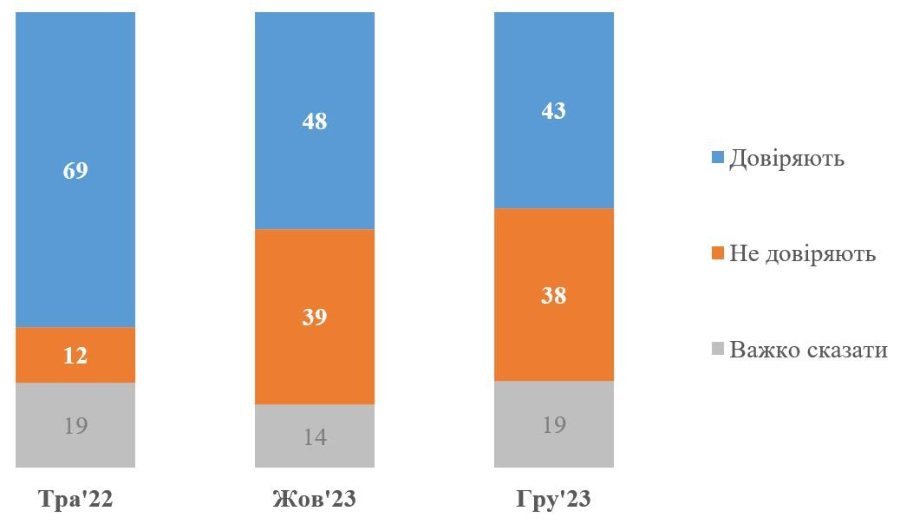 Якщо між травнем 2022 року і жовтнем 2023 року частка тих, хто довіряє, знизилася з 69% до 48%, то до грудня 2023 року показник знизився до 43%.