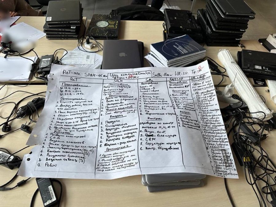 Вилучено 4000 одиниць компʼютерної та іншої техніки, понад 650 мобільних телефонів та 200 комплексів ip-телефонії, 1500 сімкарт різних операторів, «чорнові» записи, методички, понад 700 тис грн в національній та іноземній валюті.