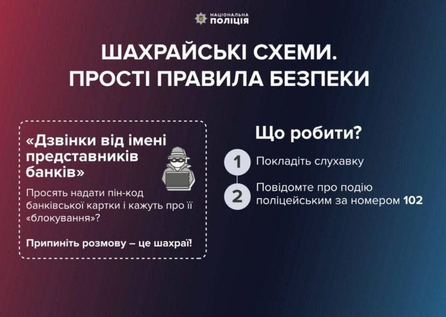 «Правоохоронці вчергове наголошують і застерігають: якщо вам телефонують із будь-якими питаннями стосовно банківських рахунків, перервіть розмову і сконтактуйте з представником фінустанови за вказаним на звороті картки номером», - йдеться у повідомленні.