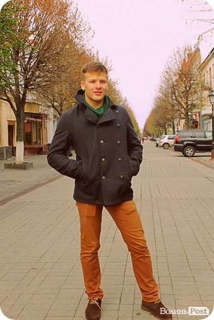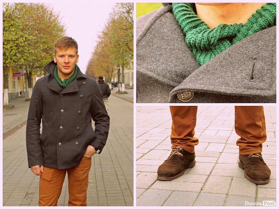 На фото Андрій одягнений у пальто сірого кольору, светр смарагдового кольору із коміром, штани із коричневим відтінком від H&M та коричневі черевики із замші.