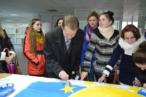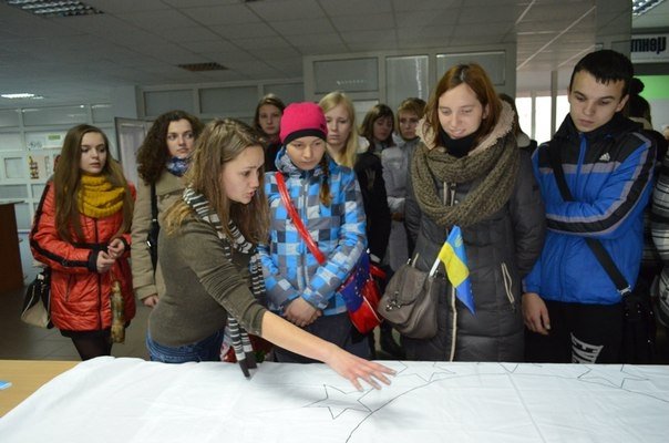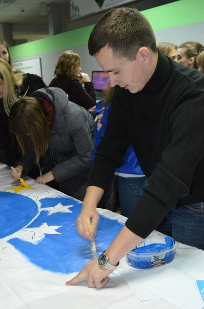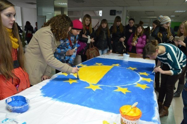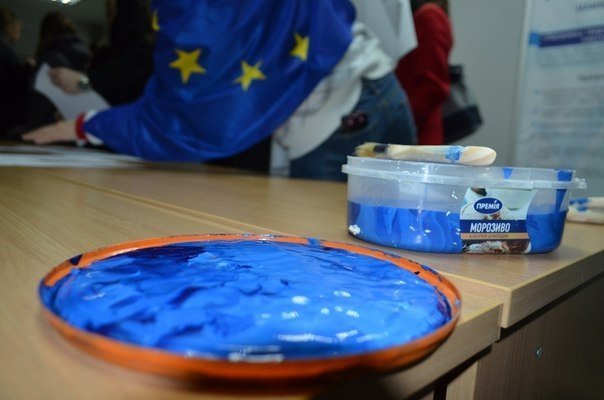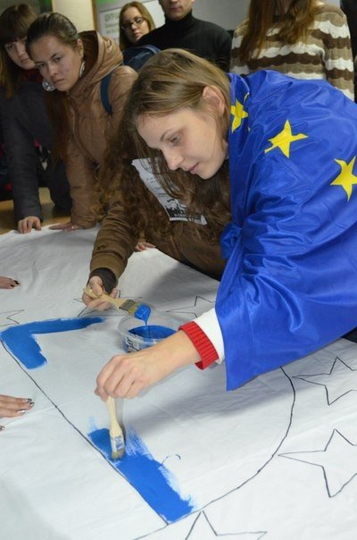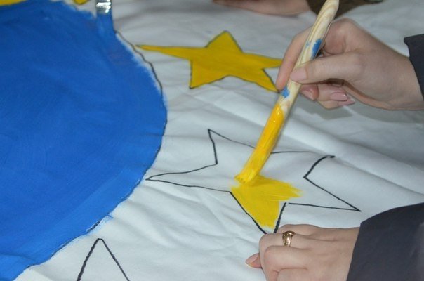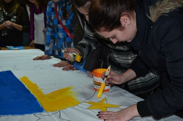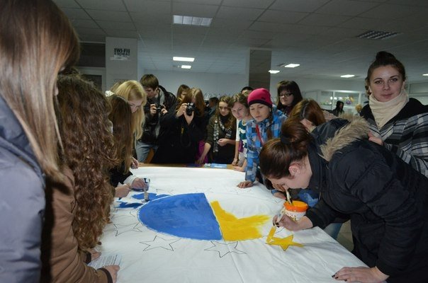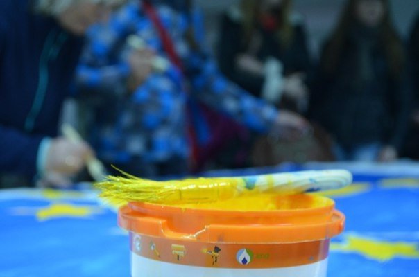 Студентам було запропоновано розмалювати полотно у відповідні кольори європейського та українського прапорів.