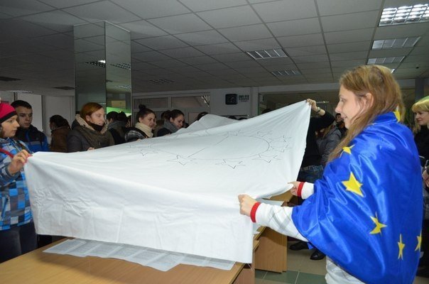 У холі було розгорнуте біле полотно з контурами європейських зірочок, а в центрі коло, розділене на дві частини - для українського прапора.