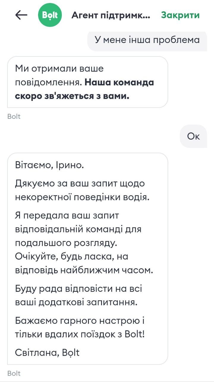 Чат-бот у додатку Bolt теж запевнив, що скаргу на некоректну поведінку водія передав відповідальній команді для подальшого розгляду. Але яким чином у службі таксі відреагують - невідомо.