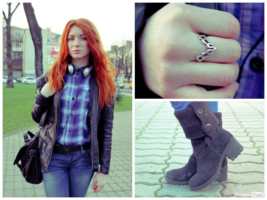 На фото Олександра одягнена у шкіряну куртку чорного кольору, сорочку синього кольору в клітинку NEW LOOK, сині джинси COLIN’S, чорні замшеві чоботи із в’язаними вставками.