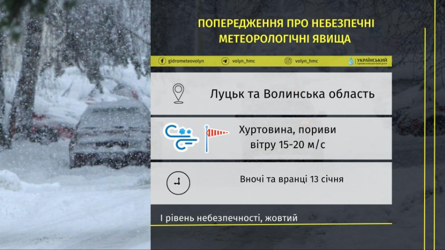 «13 січня вночі та вранці, в Луцьку та по області, очікуються пориви вітру 15-20 м/с, хуртовина. Рівень небезпечності – І, жовтий», - йдеться у повідомленні.