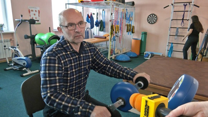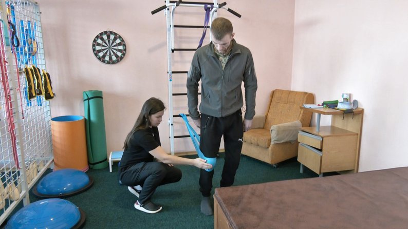У залі фізичної терапії медики працюють із пацієнтами над відновленням рухових функцій. Як розповів 28-річний військовий Петро Клиш, 2016 року отримав на службі травму коліна, а через воєнні дії не мав змоги достатньо часу приділити лікуванню.
