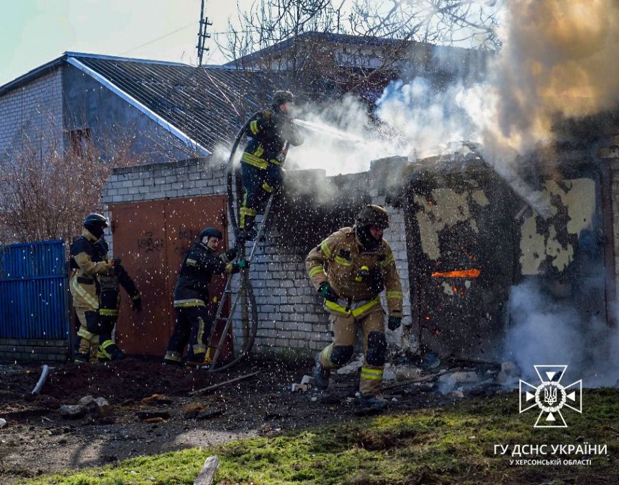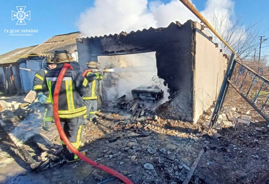 Під обстрілом було і село Ромашкове, де також загорілось гаражне приміщення та автівка. Білозерські рятувальники загасили пожежу.
