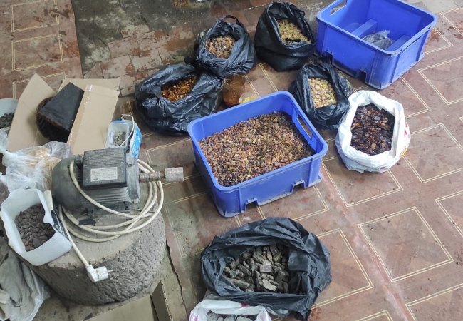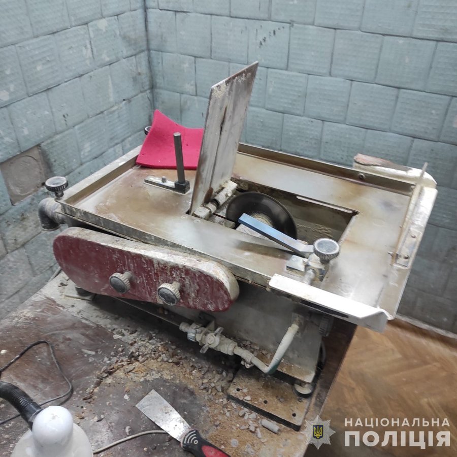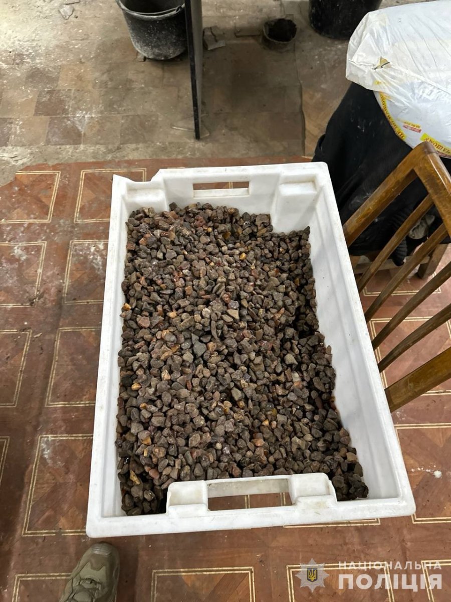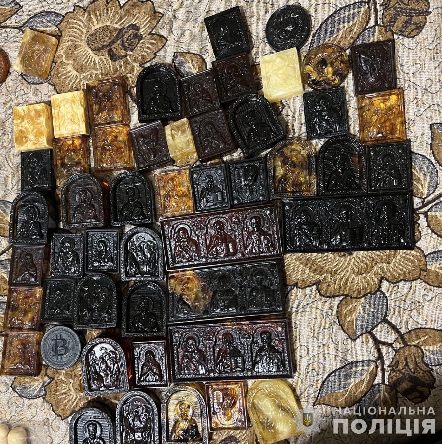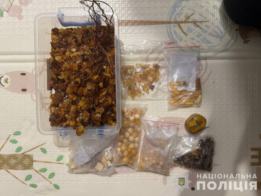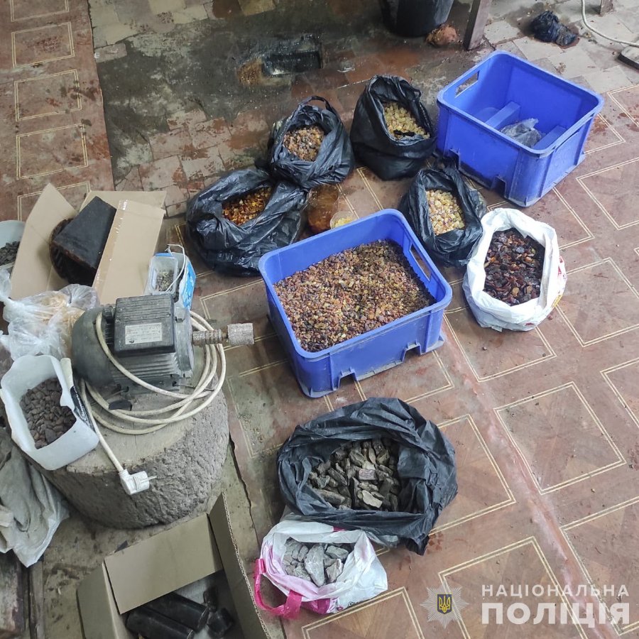 Слідчі вилучили різноманітне знаряддя для обробки каміння, мобільні термінали й телефони, чорнові записи, документи та інші докази, що свідчать про причетність до незаконного видобутку, скупки, обробки бурштину та його реалізації за межами України.