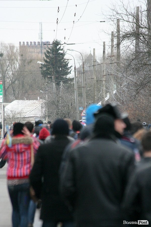 Відтак вулицею Гнідавською студенти вирушили до колишньої синагоги, повернули на Драгоманова, а потім на Кафедральну - пройшли біля католицького собору до Волинського технікуму Національного університету харчових технологій. Проте там студентів не пустили. З криками "Ганьба!" колона пішла вулицею Братковського.