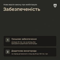 Грошове забезпечення у законопроєкті визначено мінімумом у 20 тис. грн без урахування додаткової винагороди. Додаткова винагорода на період воєнного стану закладається від 30 тис. до 100 тис. грн.