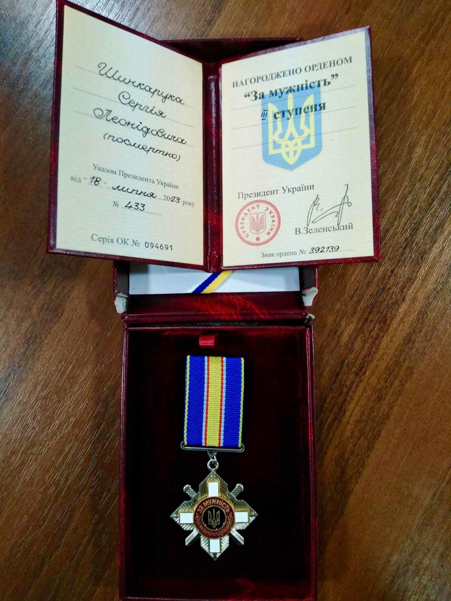 За особисту мужність і самовіддані дії, виявлені у захисті державного суверенітету та територіальної цілісності України солдата Сергія Шинкарука посмертно нагороджено орденом "За мужність" III ступеня.