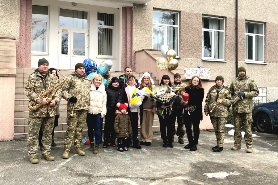 Наталію Цибу із синочком на виписці зустрічали побратими загиблого чоловіка, родина, друзі та представники місцевої влади.
