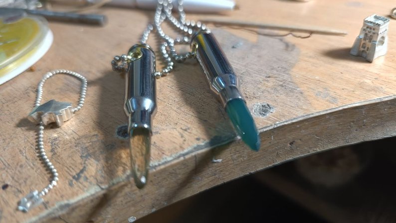 Серед незвичних прикрас ювеліра — кулони, що зроблені зі справжніх гільз. Зі слів Тараса Янюка, їх йому передали українські військовослужбовці безпосередньо із передової.