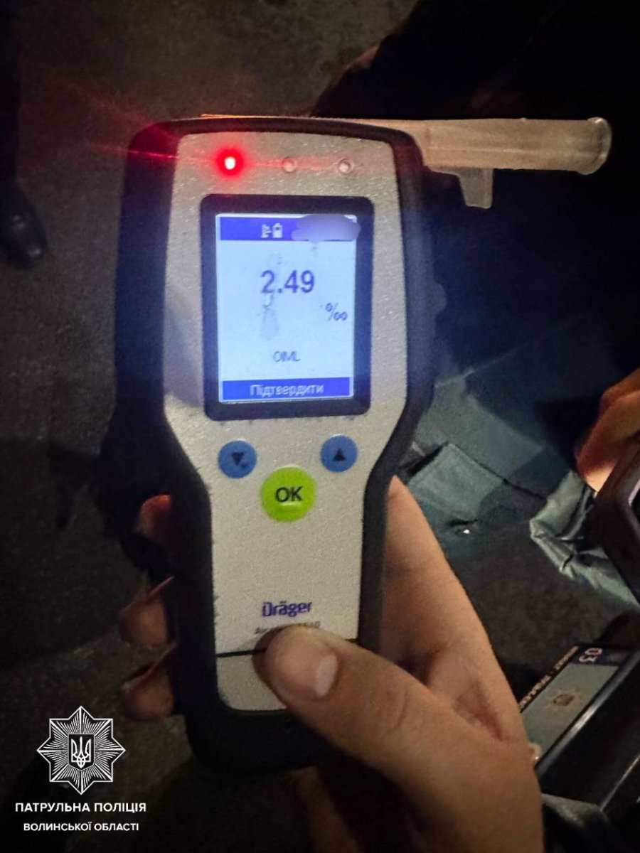 У жінки також були виявлені ознаки алкогольного сп’яніння, і вона погодилася пройти огляд за допомогою приладу Драгер на місці події. Результат становив 2,49 проміле, що перевищує максимально допустиму норму у майже 13 разів.