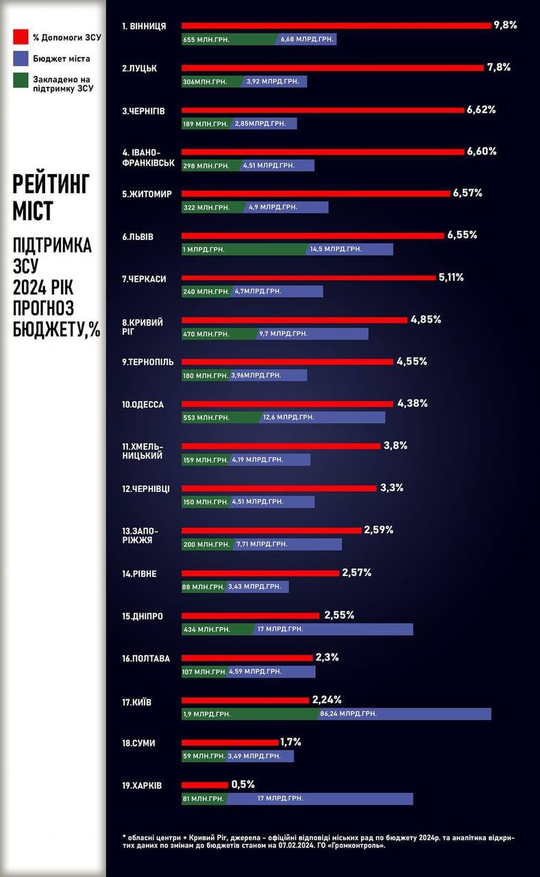 "Луцьк зайняв друге місце серед обласних центрів України за коштами, виділеними з бюджету на підтримку ЗСУ у 2024 році (у відсотковому значенні).