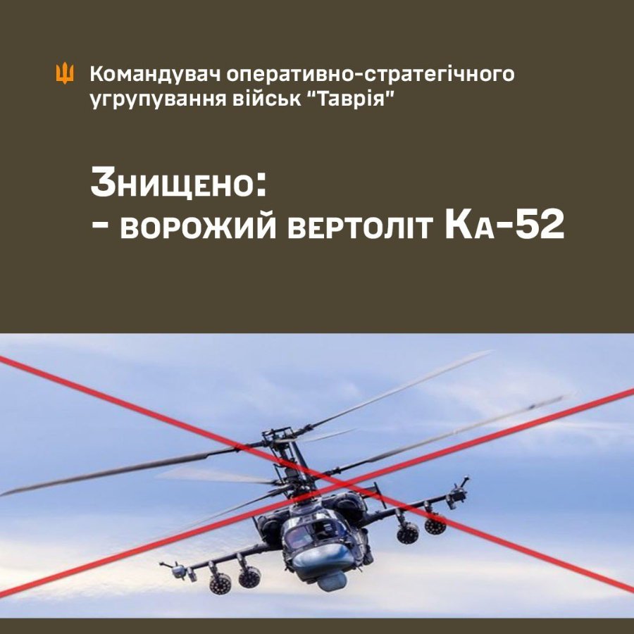 Військовослужбовці механізованого підрозділу ЗСУ на Таврійському напрямку знищили ворожий гелікоптер Ка-52 «Алігатор».