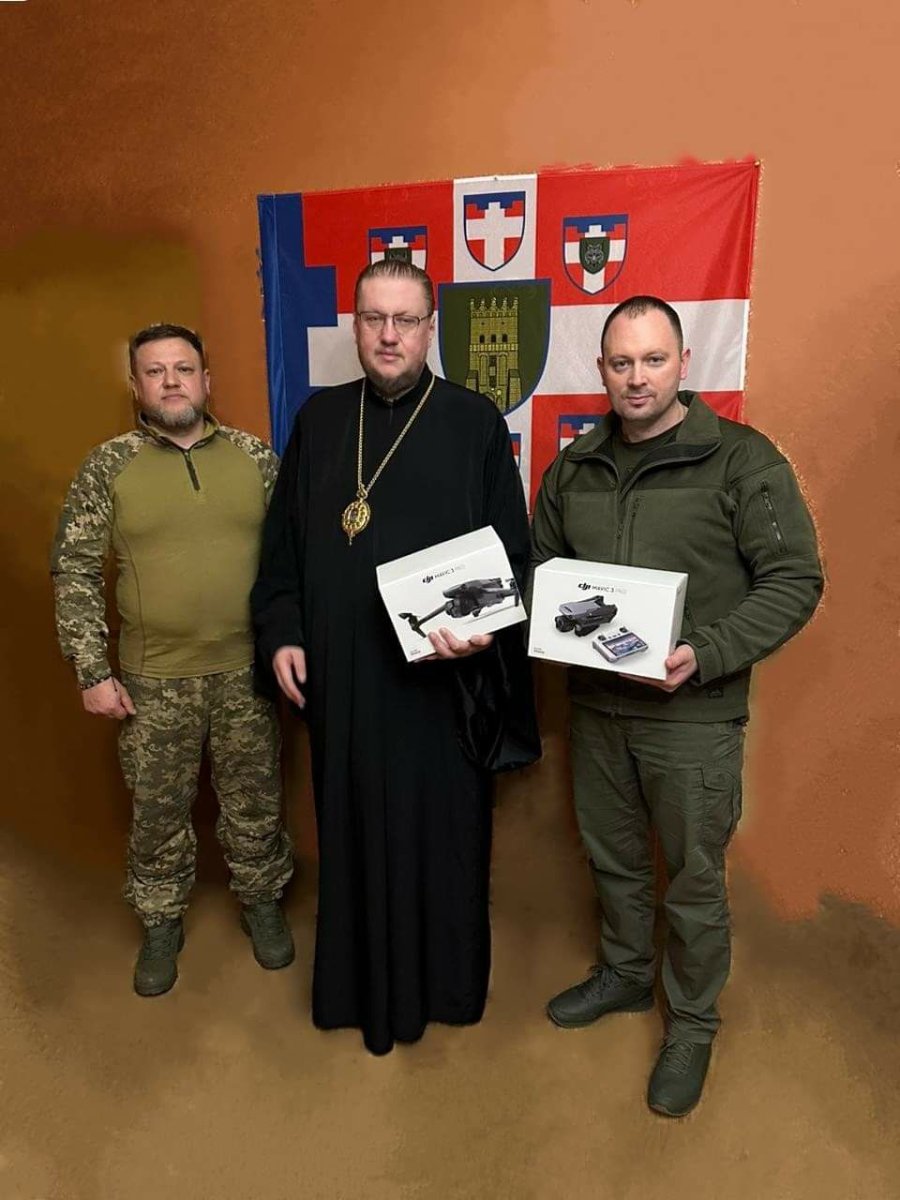 Архієпископ Матфей передав землякам-волинянам засоби, закуплені на зібрані єпархією кошти. Йдеться, зокрема, про три квадрокоптери DJI MAVIC 3 Pro, антидронову рушницю, чотири генератори, бензо- та ручний інструмент, побутову хімію, силу-силенну всіляких смаколиків, а також патріотичні малюнки, створені маленькими волинянами!