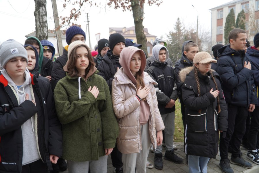 На пам’ятний захід під стінами школи зібрались педагоги, учні, а також рідні загиблих воїнів.
