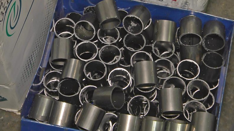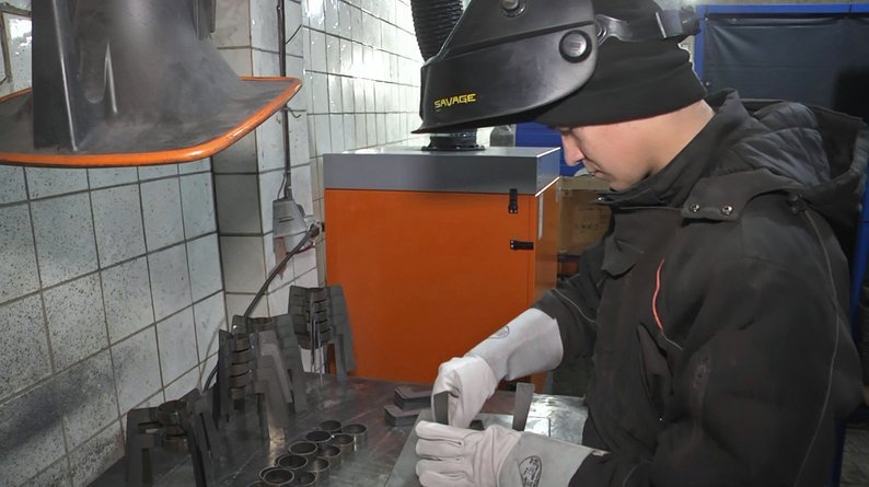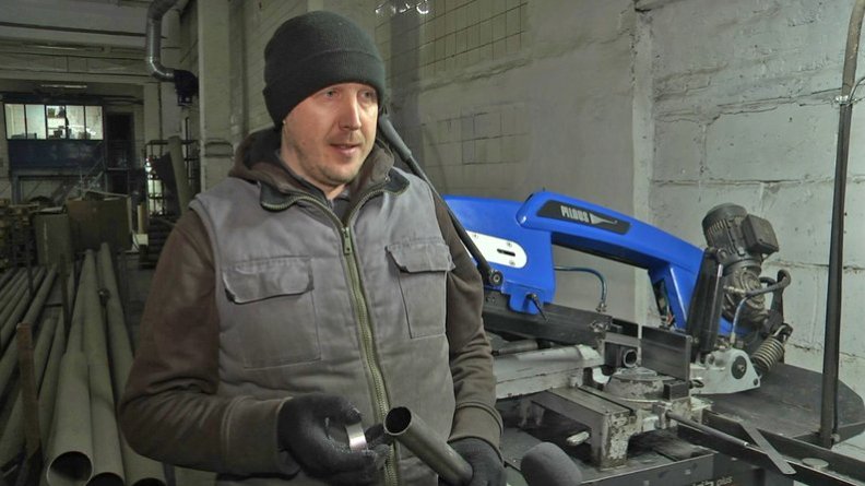 "Для виготовлення окопних підставок ми використовуємо трубу 55 мм, і ріжемо на отакі сегменти на стрічкопильному верстаті. Це займає приблизно година-дві часу", — сказав працівник підприємства.