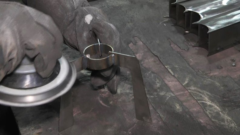 "Кондуктор складається з трьох фіксаторів, які тримають кронштейни. Вони служать для того, щоб кожна підставка для окопної свічки виходила однаковою і геометрично правильною. Три кронштейни завдовжки 20 см і трубка, нарізана на механічній пилці: все це виготовлене з листкового металу", — каже працівник.
