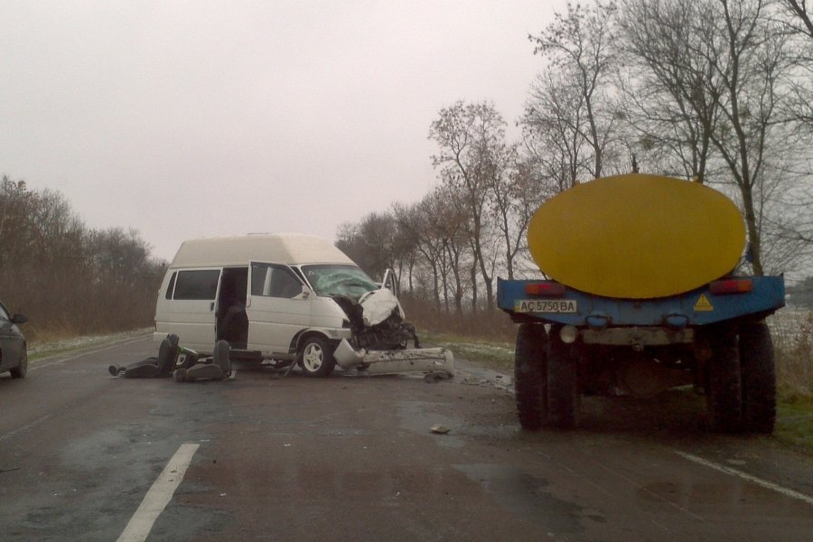 Приблизно о 10:00 зіткнулися мікроавтобус, який їхав у напрямку Луцька, і молоковоз, що їхав на зустріч бусу.