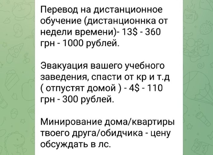 Зловмисник створив свій канал у Телеграмі (назву не вказуємо, щоб не робити реклами), в якому він приймає «замовлення» на мінування у різних країнах та містах. У спеціальному чаті його підписники-школярі пишуть сотні повідомлень за хвилину з проханнями замінувати їхню школу. Також, як зазначено на сторінці, він це робить за гроші. Проте, не варто виключати того, що створення даного Телеграм-каналу - відволікаючий маневр, на якому використовують реальне бажання дітей не вчитися, і це одна зі схем кібертерористів.
