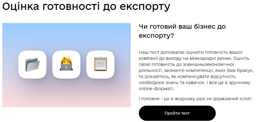 Перед прийняттям рішення щодо виходу на зовнішні ринки оцініть готовність вашої компанії до експорту, скориставшись онлайн послугою «Оцінка готовності до експорту». Ви зможете перевірити свою готовність до зовнішньоекономічної діяльності, визначите компетенції, яких вам бракує, та дізнатися, як компенсувати відсутність необхідних знань та навичок. Наразі уже 1 302 компаній пройшли тест на готовність до експорту, 92% із них — налагодили ефективнішу експортну стратегію і 535 компаній потрапили до Каталогу українських експортерів.
