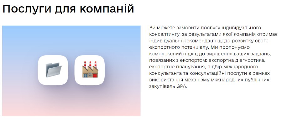 Окрім цього на порталі Дія.Бізнес: Експортний напрям для підприємців доступні підбірки освітніх програм на тему експортної діяльності, покрокові ґайди із пошуку партнерів і залучення інвестицій, практичні посібники з експорту, велика база публікацій, тематичні онлайн-курси.