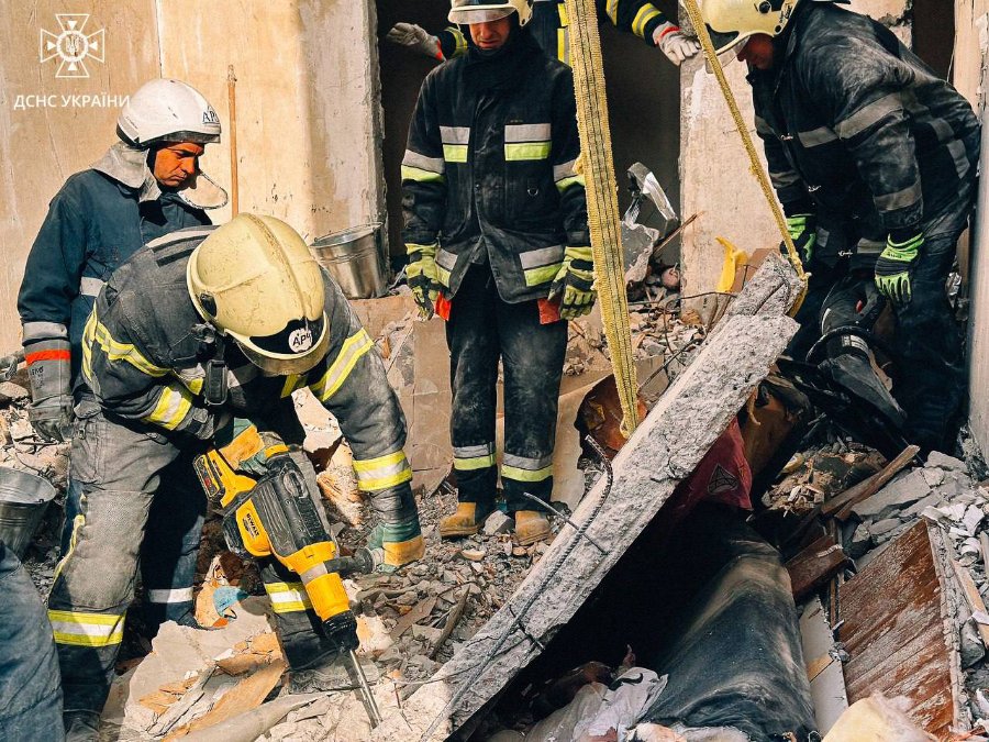 За попередніми даними, внаслідок нічного удару росіян, зруйновано 18 квартир дев’ятиповерхового житлового будинку. На місці проводяться першочергові аварійно-рятувальні роботи в безперервному режимі, до яких від ДСНС залучено 92 особи та 23 одиниці техніки, також праюють психологи ДСНС та кінологічні розрахунки.